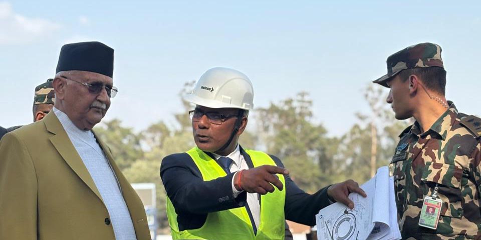 सम्माननीय प्रधानमन्त्री श्री केपी शर्मा ओलीज्यू कीर्तिपुर क्रिकेट मैदानमा निर्माणाधिन अन्तर्राष्ट्रियस्तरको प्यारापिड निर्माण र फ्लडलाइट जडान कार्यको २०८२ जेठ २५ गते निरीक्षणको क्रममा कार्यालयका सु.ई. श्री चक्रवर्ती कंठज्यूबाट आयोजनाबारे जानकारी गराउदै ।